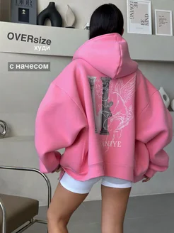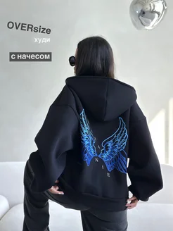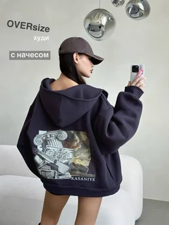 Худи оверсайз на молнии с начесом и принтом, кофта теплая