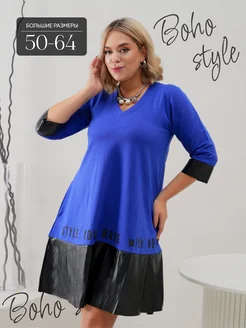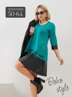 Платье трапеция трикотажное с эко-кожей больших размеров