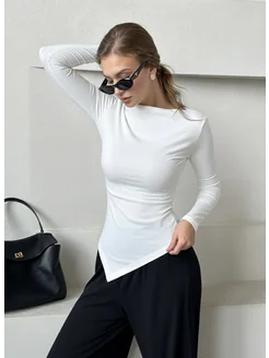 Лонгслив облегающий хлопок с вырезом лодочка асимметричный