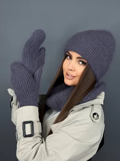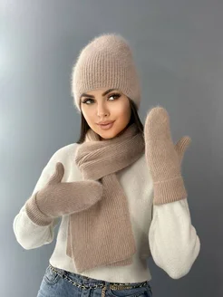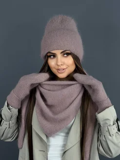 Шапка вязаная с шарфом и варежками из ангоры с пухом норки