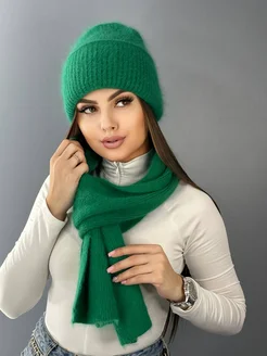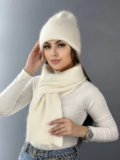 Шапка вязаная с шарфом из ангоры с пухом норки