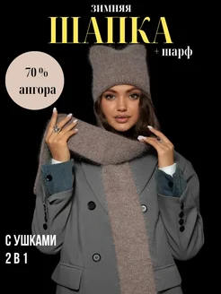 Шапка с ушками зимняя ангора вязаная 2в1, шапка с шарфом