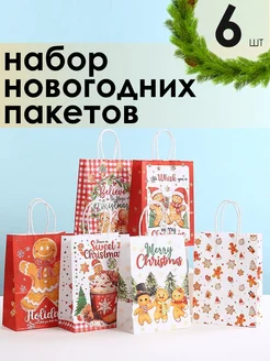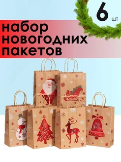 Подарочный пакет новогодний крафт, бумажный,набор 6 штук