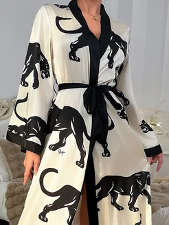 Халат кимоно домашний длинный шелковый леопардовый на запах