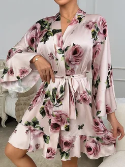 Халат кимоно домашний короткий шелковый с запахом и рюшами