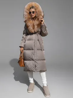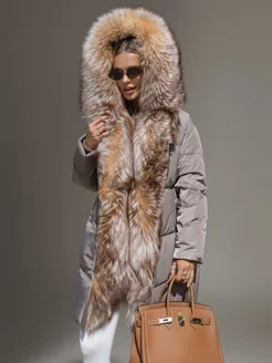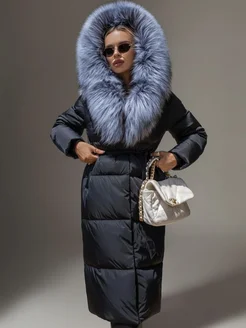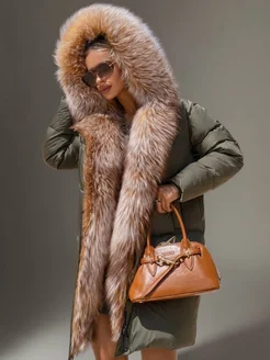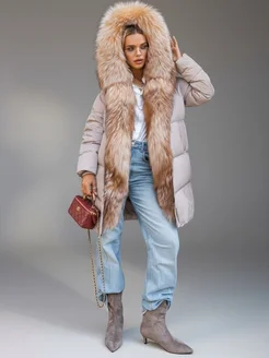 Длинный пуховик с натуральным мехом лисы и капюшоном