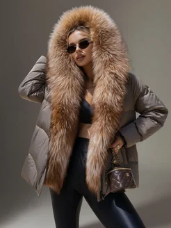 Пуховик с натуральным мехом чернобурки и капюшоном