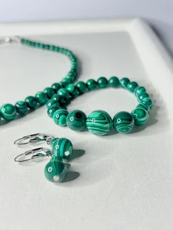 Комплект серьги, бусы и браслет из натурального малахита