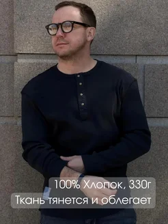 Черно-синий лонгслив в рубчик с длинным рукавом на кнопках