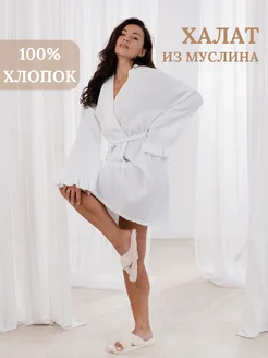 Халат домашний муслиновый из хлопка с широкими рукавами