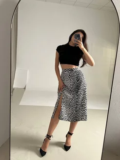 Юбка с разрезом спереди атласная на осень миди