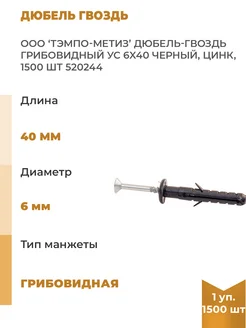 Дюбель-гвоздь грибовидный УС 6x40 черный, цинк, 1500шт