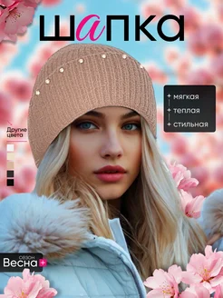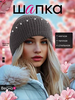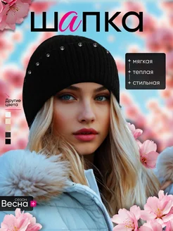 Весенняя шапка вязаная Бини с отворотом и стразами