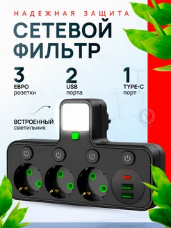 Сетевой фильтр тройник 3 розетки 2 usb + 1 type c фонарем