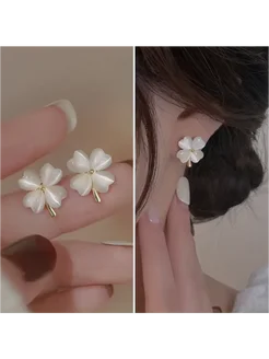 Серьги гвоздики Четырехлистник бежевый Клевер На Удачу Цветы