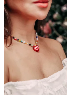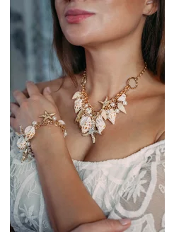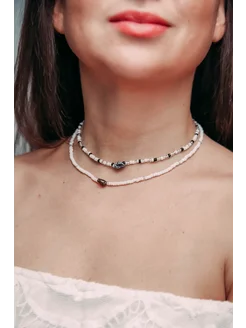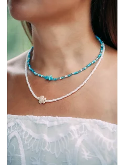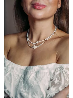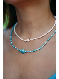 Чокер из бисера тройной с черепахой ракушкой и звездами