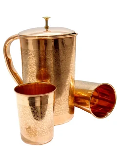 Медный кувшин с крышкой (латунная ручка) и два стаканам