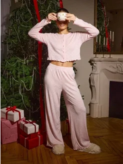 Пижама со штанами и рубашкой домашний костюм ажурный хлопок