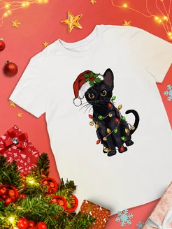 Футболка Кот В Рождественской Шапке Праздничный Принт