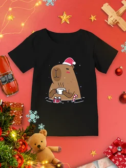 Детская Футболка Капибара В Шапке Санты Новогодняя