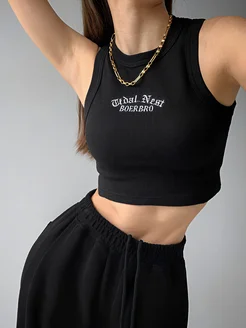 Чёрный укороченный кроп топ y2k без рукавов, в рубчик