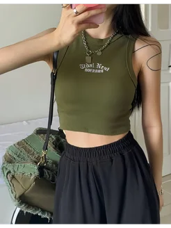 Зеленый укороченный кроп топ y2k без рукавов, в рубчик