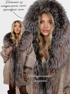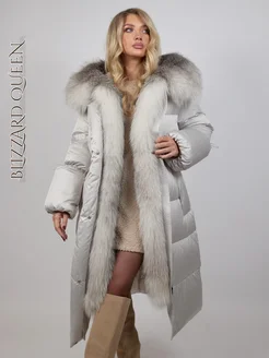 Длинный зимний пуховик с натуральным мехом лисы и капюшоном