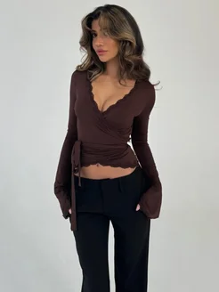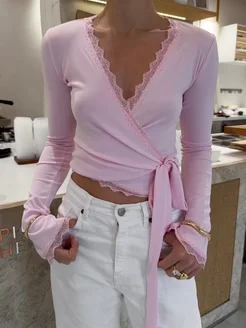 Лонгслив с кружевом на запах приталенный