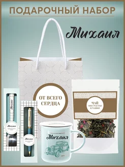 Подарочный набор чая и именная кружка, ложка, ручка Михаил