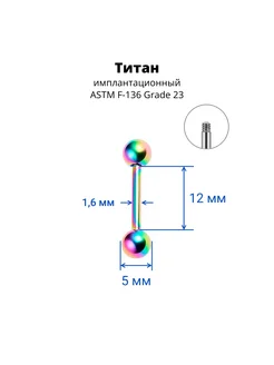 Штанга 1,6 мм для пирсинга языка и сосков. Титан, радужное