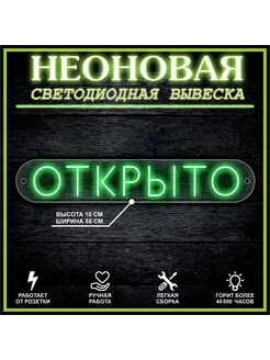 Неоновая вывеска ОТКРЫТО горизонтально 55х10см зеленый