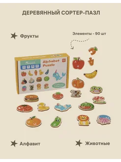 Деревянный Сортер «Алфавит с Животными и Фруктами» - 90 шт