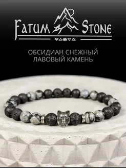 Браслет из камней. Обсидиан снежный. Лава. Лис (нерж.ст.)