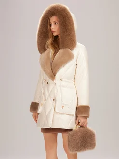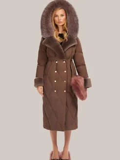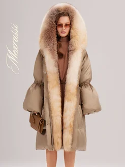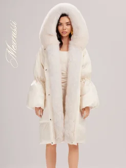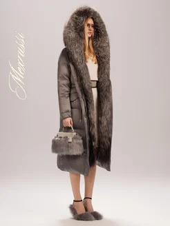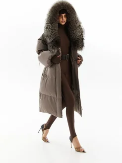 Длинный пуховик с мехом натуральной лисы и капюшоном