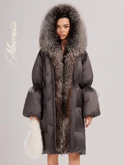 Длинный пуховик с натуральным мехом и капюшоном