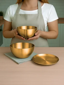 Набор салатников и тарелка из нержавеющей стали золотые