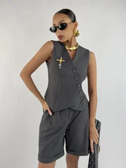 Костюм жилет женский с шортами серый