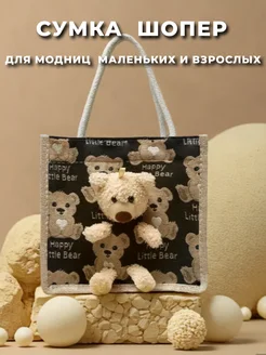 Сумка мини шоппер с мишкой темно-бежевая