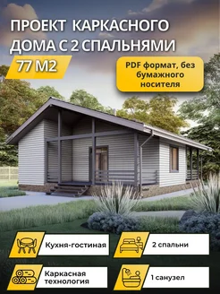 Проект одноэтажного каркасного дома 77 м2 с 2 спальнями
