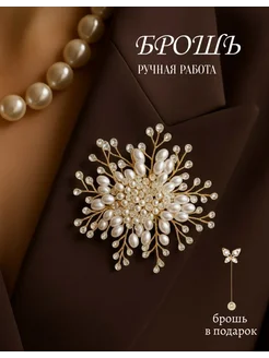 Брошь-подкова золотистая с жемчужиной и брошь-клевер