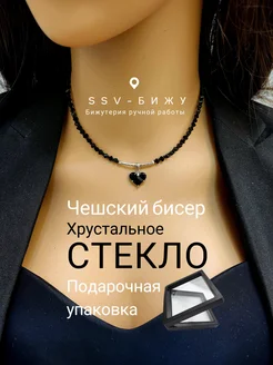 Чокер блестящий на шею с сердцем стекло бисер черный