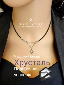 Чокер на шею с сердцем черный бисер серебристый хрусталь