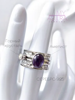 Кольцо-механизм с аметистом кабошон и горным хрусталём