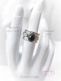 Кольцо-механизм с чёрным агатом кабошон и горным хрусталём