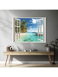 Картина Окно, вид из окна на океан, пальмы, лодки, 80*100 см