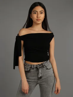 Приталенная футболка топ с драпировкой с открытыми плечами