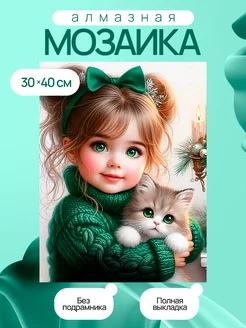Алмазная мозаика без подрамника 30*40 девочка с котенком