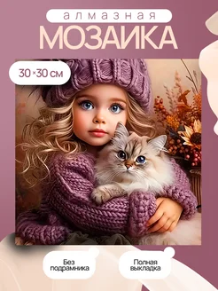 Алмазная мозаика без подрамника 30*30 девочка с котенком