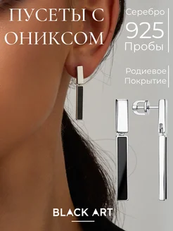 Серебряные серьги прямоугольные с чёрным камнем ониксом