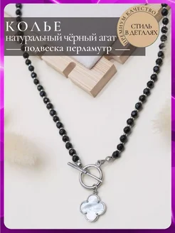 6507 Колье из черного агата с подвеской клевер в серебре хит